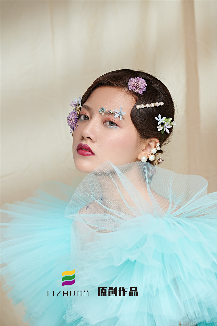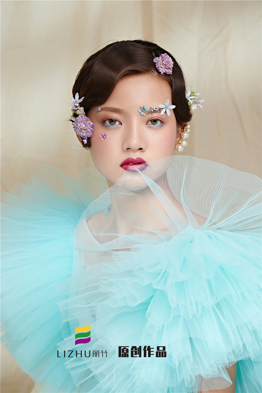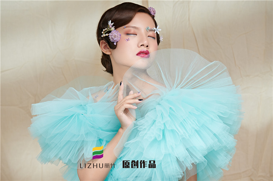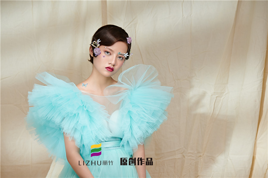 麗竹學校彩妝作品---氣質名媛造型:藍色輕紗加上妝容花朵點綴,頭飾與發(fā)型的完美搭配,流淌出輕柔舒緩之美,簡約自然的情緒態(tài)度。
