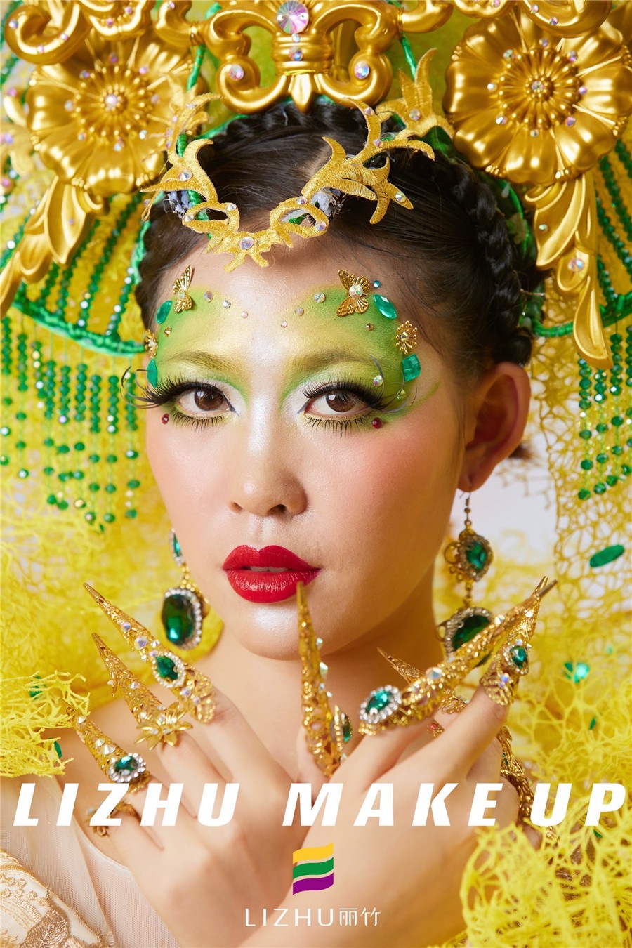 南寧化妝綠色創(chuàng)意妝容作品---綠野仙蹤:作品整體造型采用綠色與黃色相碰撞,突顯出了大氣神秘、富貴、極富時尚感的妝造氣質(zhì)。綠色的眼影色,則暈染展現(xiàn)出了女性的冷艷。視覺強烈的大紅唇,體現(xiàn)女性特有的妖嬈與性感,在利用金色裝飾品點綴妝容,使其襯托下整體視覺感更加突出。