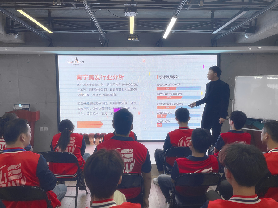 宣講會上,梁經(jīng)理在現(xiàn)場不僅和同學(xué)們討論了南寧美發(fā)專業(yè)培訓(xùn)學(xué)校學(xué)習(xí)技術(shù)的好處以及必要性,南寧美發(fā)行業(yè)的市場分析,針對學(xué)員們提出的疑問,如南寧美發(fā)設(shè)計(jì)師不同級別的收入情況,南寧常見美發(fā)店的分類及項(xiàng)目介紹,南寧有規(guī)模的美發(fā)店人員配置,南寧美發(fā)從業(yè)人員從基層開始的晉升機(jī)制等,關(guān)乎美發(fā)新人如何成長的重要內(nèi)容都做出了詳細(xì)解釋。