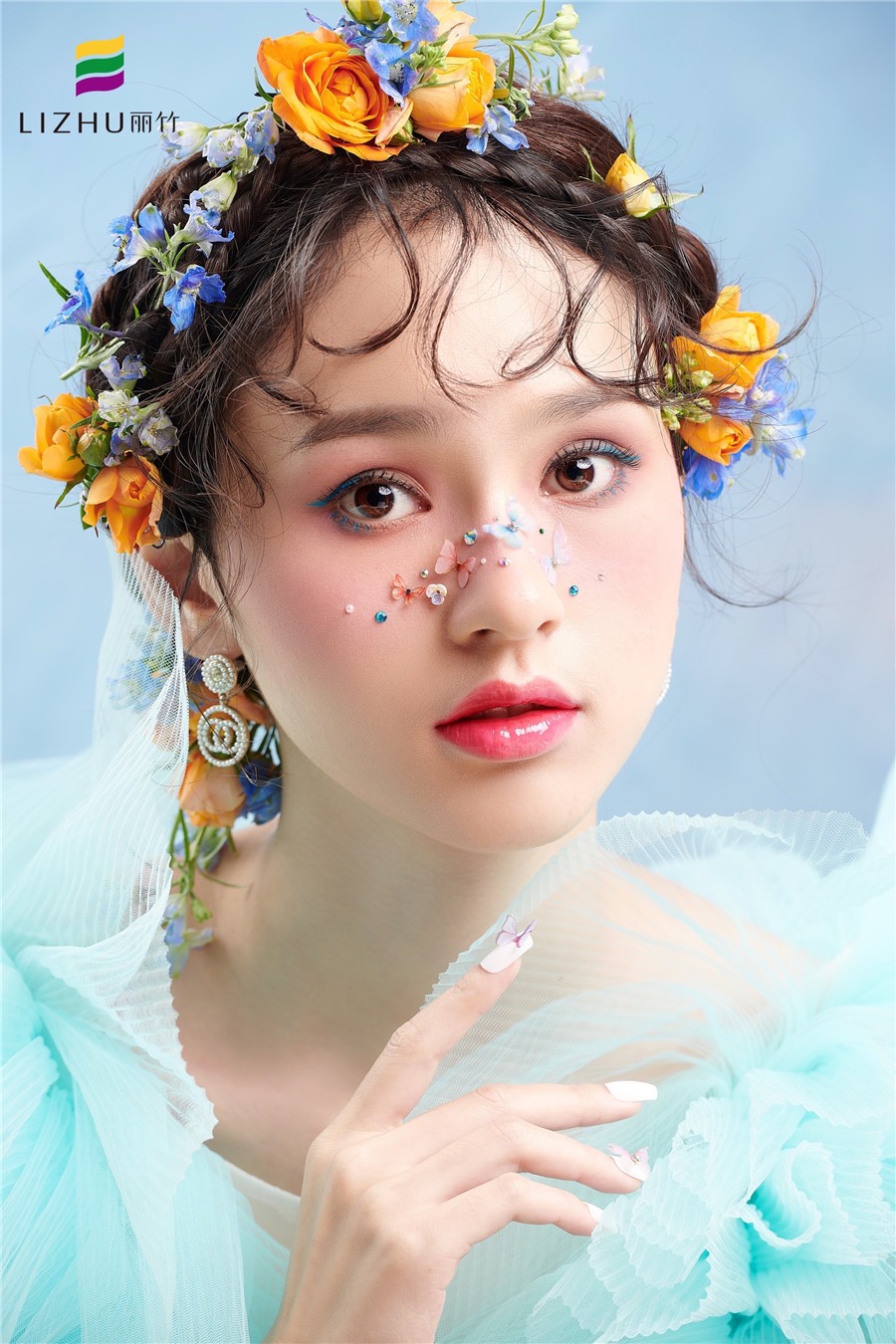 南寧化妝培訓學校作品---減齡鮮花造型:完美碰撞出浪漫少女感,藍色眼線與紗裙的絕美搭配,捕獲清新浪漫的夏日芬芳,空氣中滿是花漾沁襲的甜蜜感 。