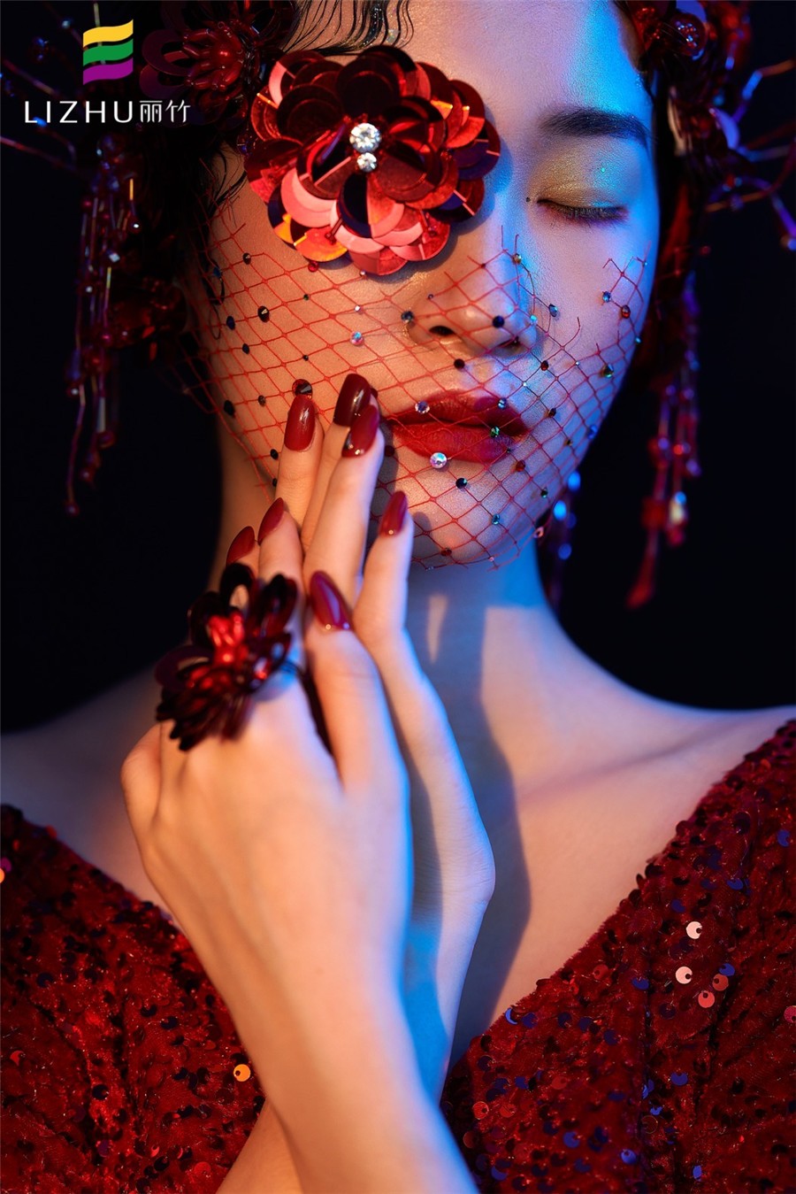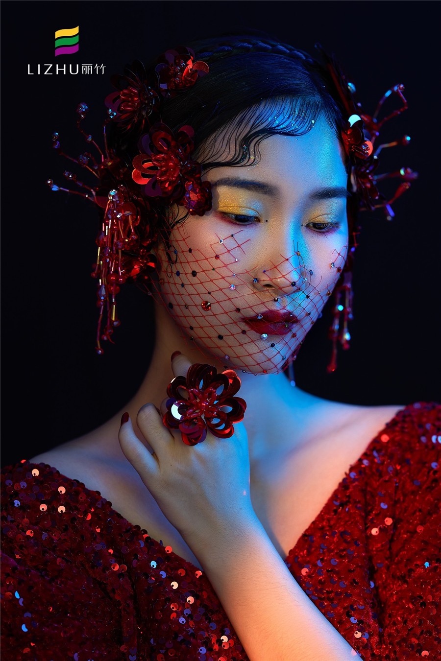 南寧化妝培訓(xùn)(麗竹化妝學(xué)校)作品---輕奢復(fù)古名媛造型:紅色亮片禮服搭配珠光感妝容,打造一種光澤細(xì)膩且高 級感的氣質(zhì),搭配半截珠片網(wǎng)紗神秘感十足,深邃眼妝透露魅惑的感覺。
