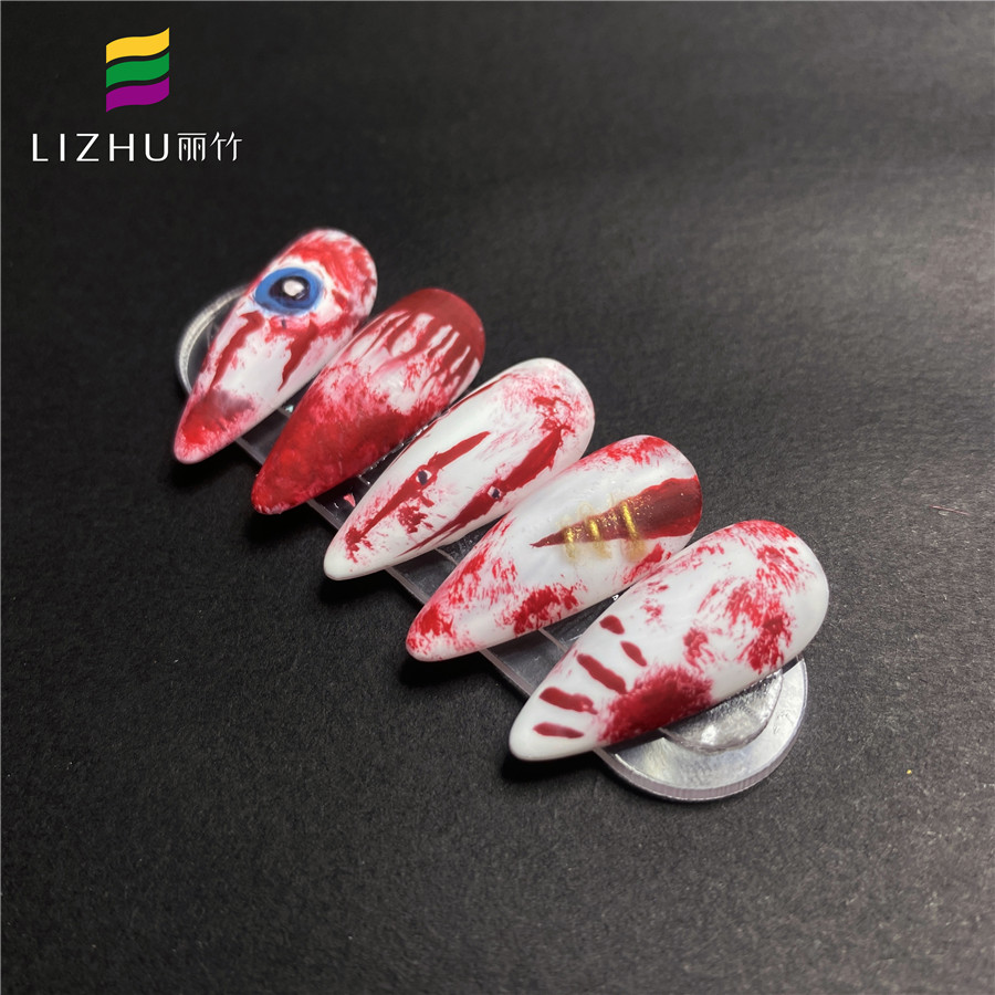 血 跡美甲圖案,白色的底色上面配上血紅色的細(xì)絲線,做成血絲的機理,一款適合恐怖角色的美甲圖案哦,什么吸血鬼、惡魔都可以試試。