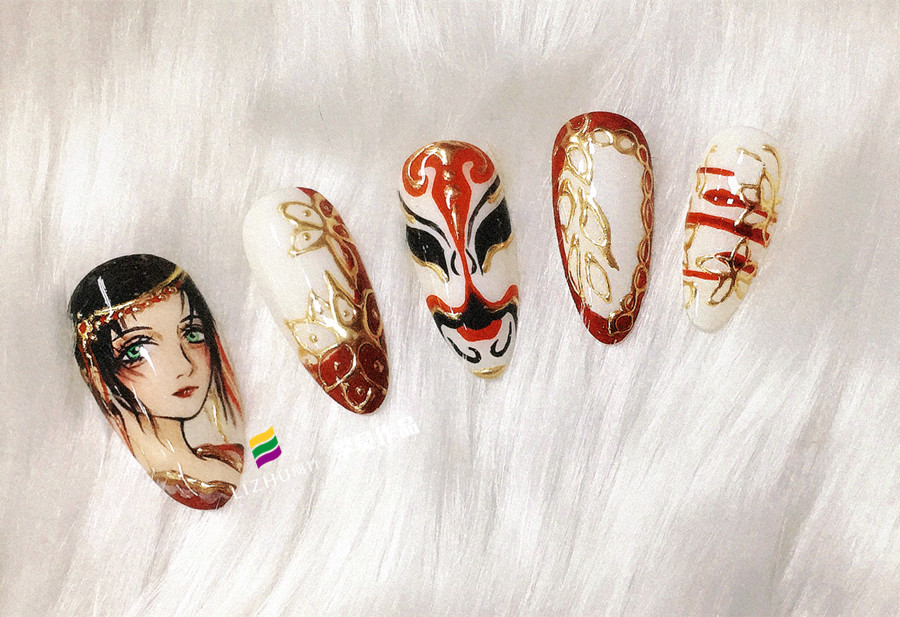 廣西美甲師培訓(xùn)班-彩繪卡通美甲:以金黃色和中國(guó)紅為主的色彩基調(diào),運(yùn)用細(xì)膩流暢的線條勾畫(huà)翩翩起舞的舞者,以及國(guó)粹臉譜形象,再加上金邊點(diǎn)綴的花朵,好一副歌舞升平的盛世景象。喜歡挑戰(zhàn)高難度繪畫(huà)的小可愛(ài)們,可以挑戰(zhàn)這款哦!