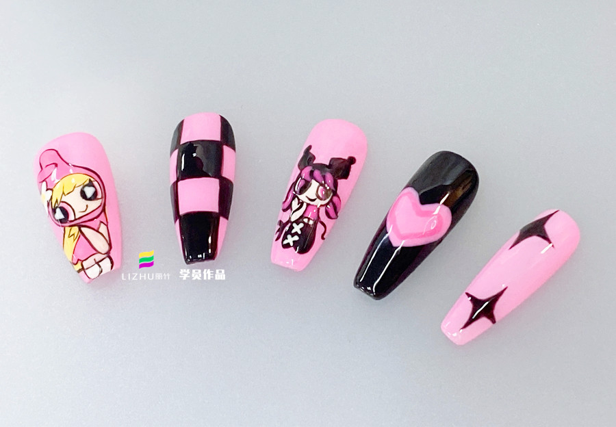 廣西美甲學(xué)校排行榜-彩繪卡通美甲:你想過(guò),當(dāng)粉色和黑色相互碰面時(shí)能擦出怎樣的火花嗎?美甲的學(xué)員們就發(fā)揮自己的創(chuàng)意,將粉色奶瓶妹與黑色棋盤(pán)格及愛(ài)心等圖案進(jìn)行組合搭配,為我們繪制出了一款不一樣的可愛(ài)風(fēng)美甲。