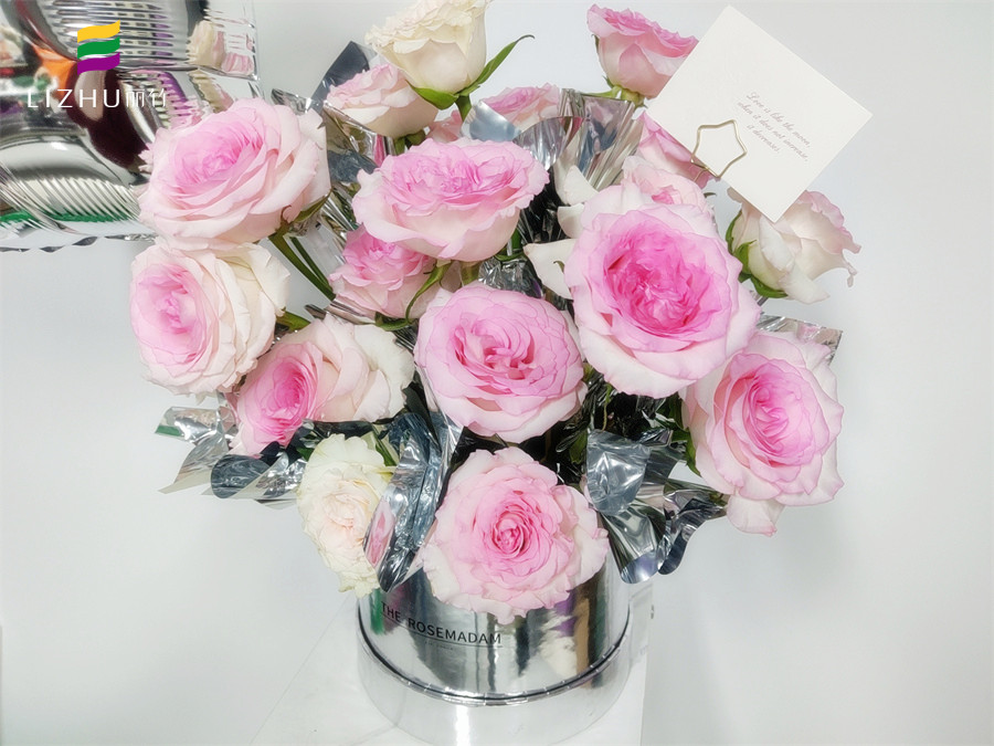 首先找到一個(gè)圓筒狀的道具(根據(jù)你的喜好來(lái)決定大小),包上你喜歡的銀色包裝紙,然后將花泥放進(jìn)桶內(nèi)。主花的位置確定好之后,以主花為高點(diǎn),按照高低排列的順序以此圍繞展開(kāi),直至形成你想要的花束輪廓出現(xiàn)。