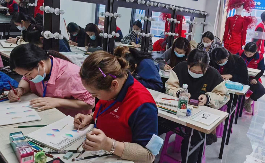 南寧化妝正規(guī)專(zhuān)業(yè)學(xué)校-學(xué)員正在進(jìn)行眼影紙上繪畫(huà)練習(xí)