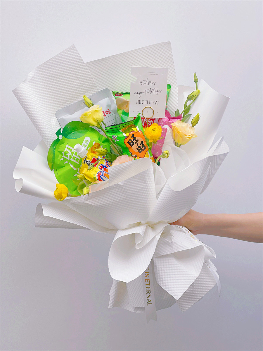 而比較常見的可以用來做花束的零食,比較熱門的則是巧克力。對于熱戀中的情人來說,送上巧克力花束不要太浪漫哦!糖果類做成的花束也深受歡迎,其中棒棒糖花束對學生黨和小朋友格外有誘惑力。如果想要看起來比較豪放,完全可以選擇膨化類商品,如薯片,本身體積大,做出來的花束也是效果驚人。此外,除了吃的,喝的也是非常適合,比如盒裝牛奶,飲料等都可以通過你專業(yè)的花藝技術打造出充滿創(chuàng)意的零食花束。