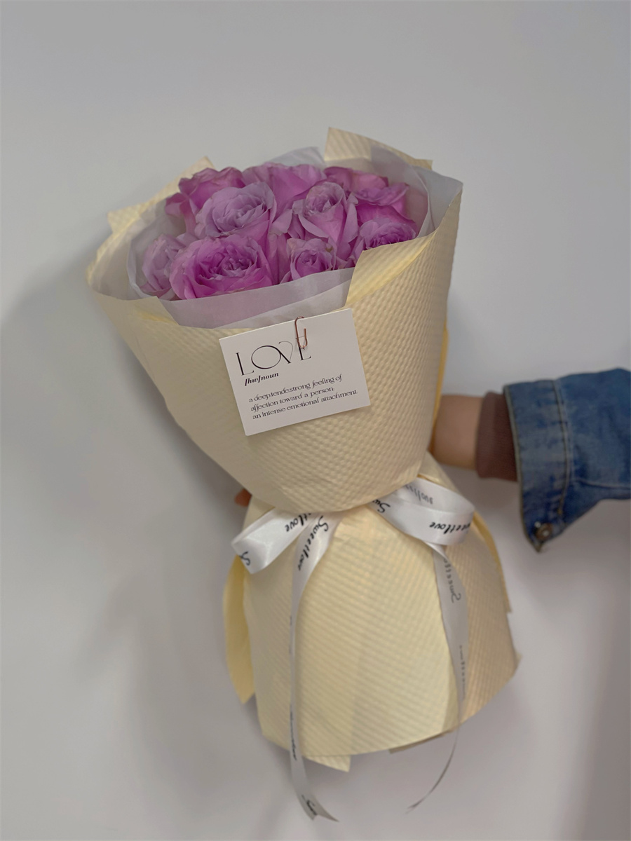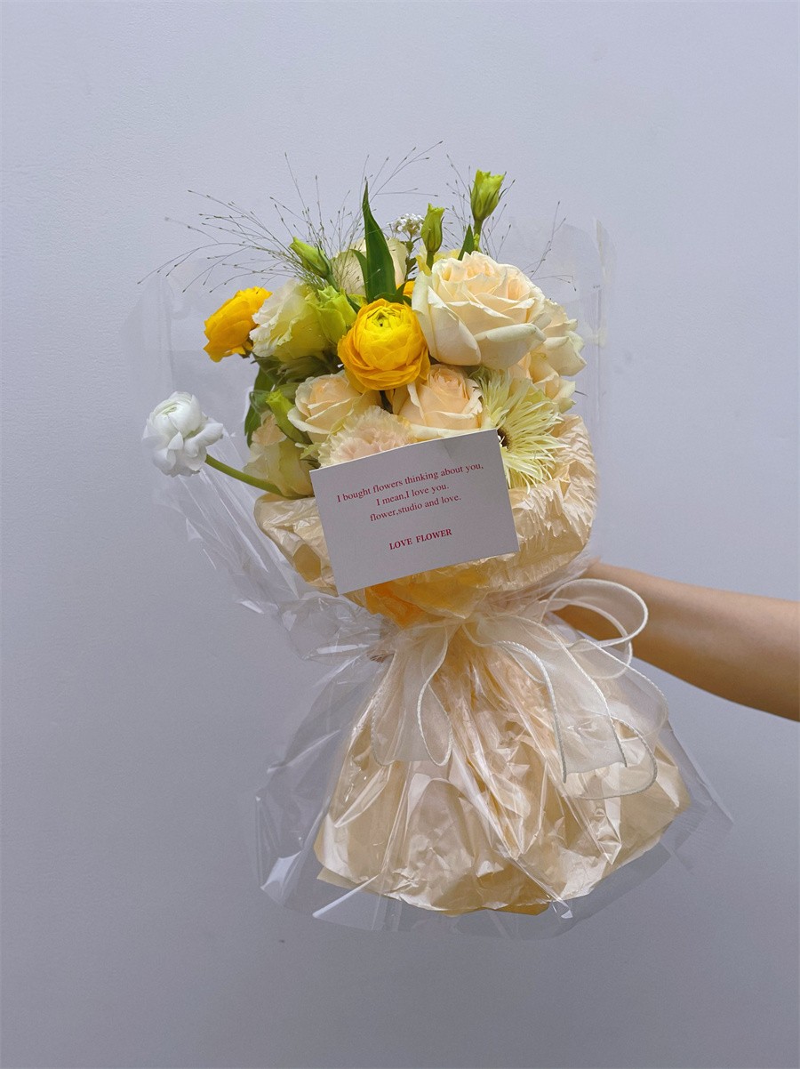 在進(jìn)行圓形花束的制作時(shí),在確定主花后,便可以按照螺旋的方式一次添加花材,使得整束花看起來飽滿之后,稍作調(diào)整成為一個(gè)圓形的輪廓,然后便可以用繩子在根部綁好進(jìn)行修剪?;ú奶幚砗昧酥螅瑢b紙裁剪出適當(dāng)?shù)拇笮?,然后根?jù)花的形狀包裹起來,用彩帶幫緊并打成一個(gè)蝴蝶結(jié),這樣圓形小花束就完成了。