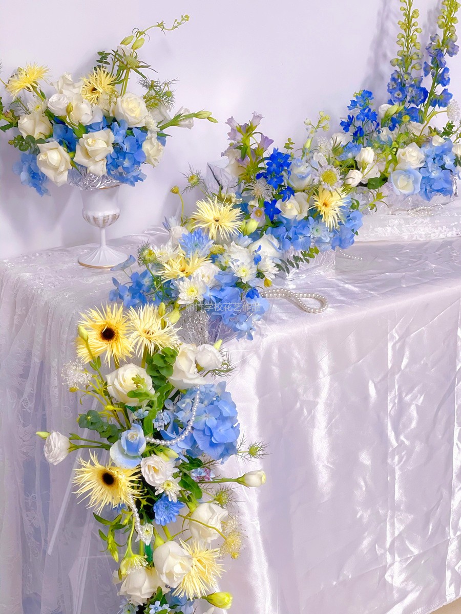 花藝插花專業(yè)教程---但如果采用的是西式長條桌,那么這種類型的桌花設(shè)計就更特別一些。一般會將話說串聯(lián)起來后,在桌面中間長長地鋪陳開來,并在桌子的兩頭會特意設(shè)計成瀑布桌花鏈接地面,營造浪味唯美的氛圍!
