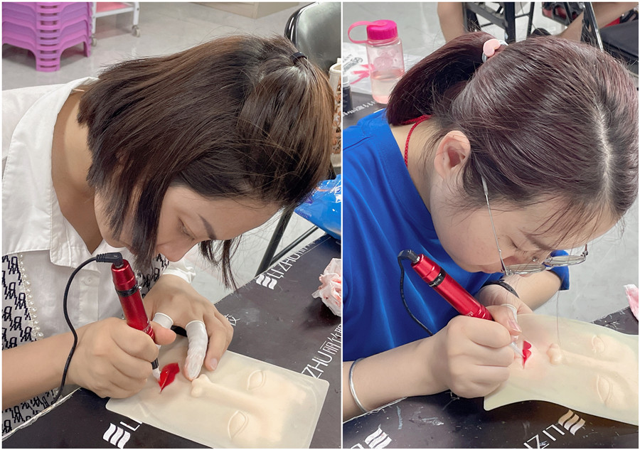 零基礎學紋繡在廣西、廣西紋唇教學:經過前面對眉眼唇的理論以及紙上練習,廣西眉眼唇學校-麗竹眉眼唇學校的同學們現在進入到了仿皮紋唇練習。廣西紋繡培訓-麗竹國際紋繡大師班本期課程已經進入尾聲,同學們也即將結束在仿皮上進行眉眼唇的練習,讓我們共同期待同學們接下來進入到紋繡真人實操的表現吧!
