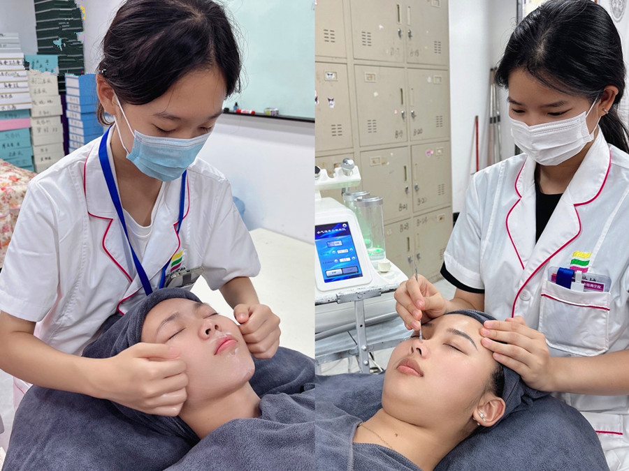 廣西美容學(xué)校的同學(xué)真在進(jìn)行面部管理手法練習(xí)