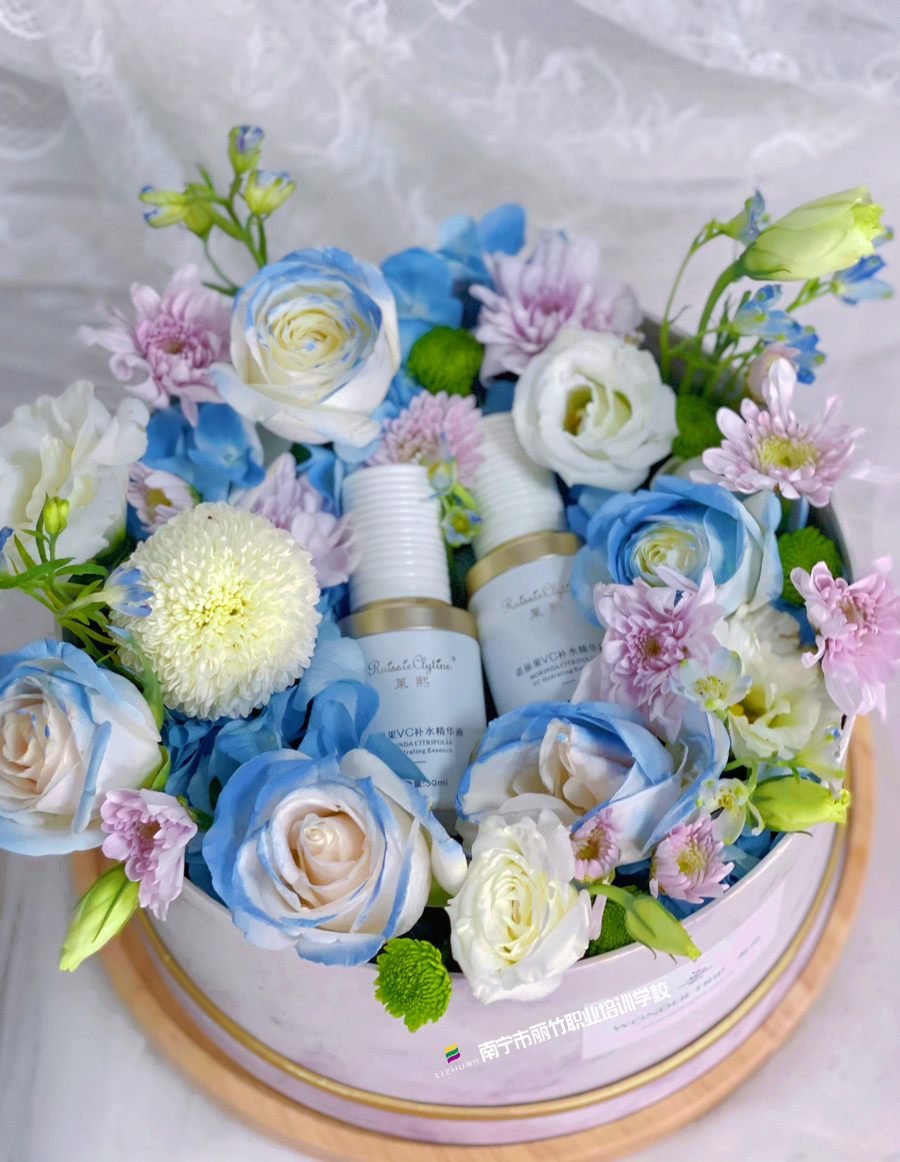 南寧花藝培訓作品:竹編手提花籃+奶油花盒+韓系桌花