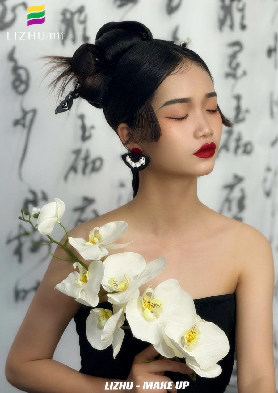 南寧新娘化妝師培訓(xùn)、南寧寫真化妝學(xué)習(xí)作品---新中式造型:一套改良版露肩中式套裝,搭配簡(jiǎn)約利落中式盤頭,將東方的優(yōu)雅和現(xiàn)代女性風(fēng)格融合,整個(gè)造型流露出一種文人筆墨下的詩(shī)意。如果你想近期在南寧學(xué)新娘化妝,那么千萬(wàn)不要錯(cuò)過(guò)南寧人物寫真化妝學(xué)校-麗竹學(xué)校年末感恩答謝會(huì)的學(xué)費(fèi)特惠福利啦!