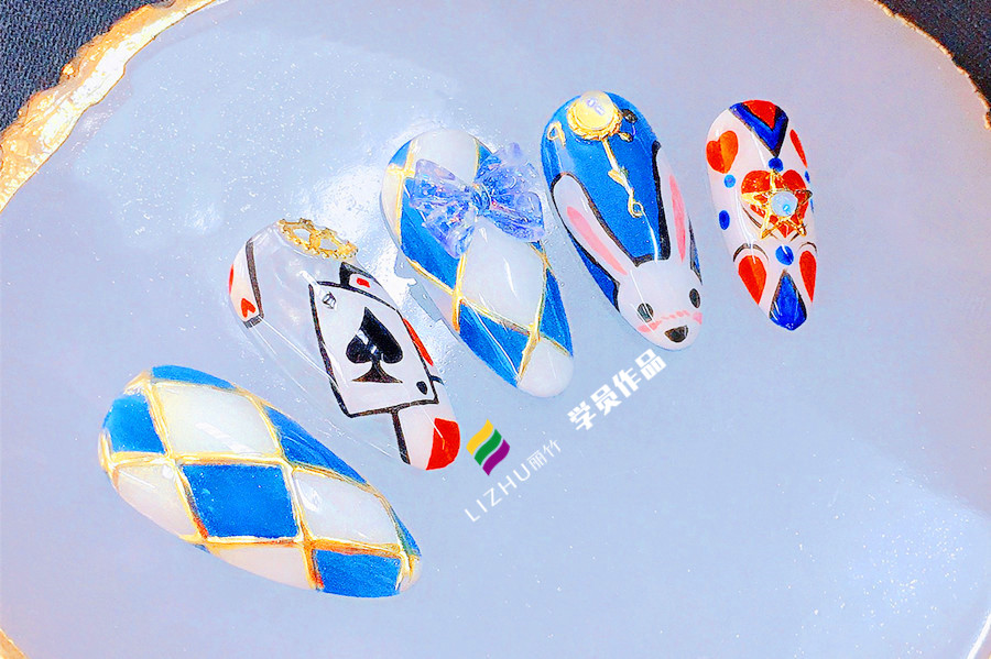 南寧美甲進(jìn)修、零基礎(chǔ)美甲學(xué)習(xí)作品---歡樂(lè)馬戲團(tuán):整副作品采用藍(lán)色和與白色相互搭配,用彩繪的畫法進(jìn)行描繪,栩栩如生的撲克與兔子圖案,更顯趣味,營(yíng)造出了一副青春洋溢的氛圍感。在南寧學(xué)美甲,為什么選南寧美甲學(xué)校-麗竹學(xué)校?是因?yàn)樵谀蠈幟兰着嘤?xùn)取得成功的美甲技能人口相傳的好口碑,是全國(guó)賽事獲獎(jiǎng)無(wú)數(shù)的專業(yè)認(rèn)定!