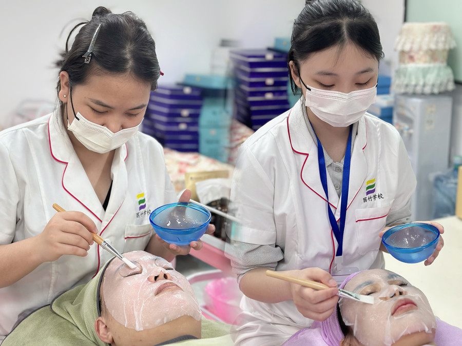 南寧皮膚管理師日常,同學(xué)們進(jìn)行面部敷膜補(bǔ)水練習(xí)