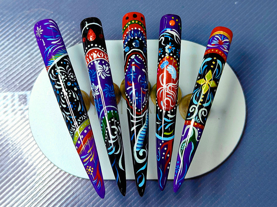 美甲技法解析:作品全程采用手繪的方式進行描繪。其難點在于對于壯錦五顏六色的色彩比例搭配,圖案間的結(jié)構(gòu)嚴謹性,排列布局的整體把握,以及在描繪圖案時需要極強的細心和耐心。