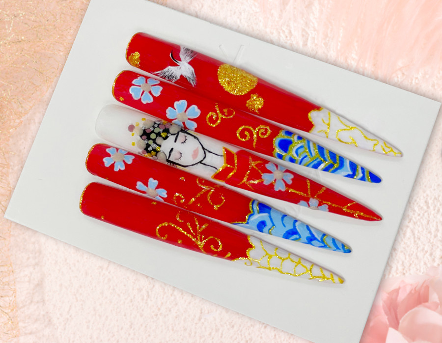 美甲技法:作品使用彩繪的方式進(jìn)行圖案描繪。色彩選擇大紅色作為主色,金色作為輔助色,外加藍(lán)色作為點(diǎn)綴,讓作品從視覺(jué)上更有層次感。而繪制的中式新娘圖案,在漫天花朵下微閉雙眼靜靜等待儀式開(kāi)始,更有金邊勾勒的出的金碧輝煌,仿佛一場(chǎng)富貴吉祥的中式婚禮躍于眼前。