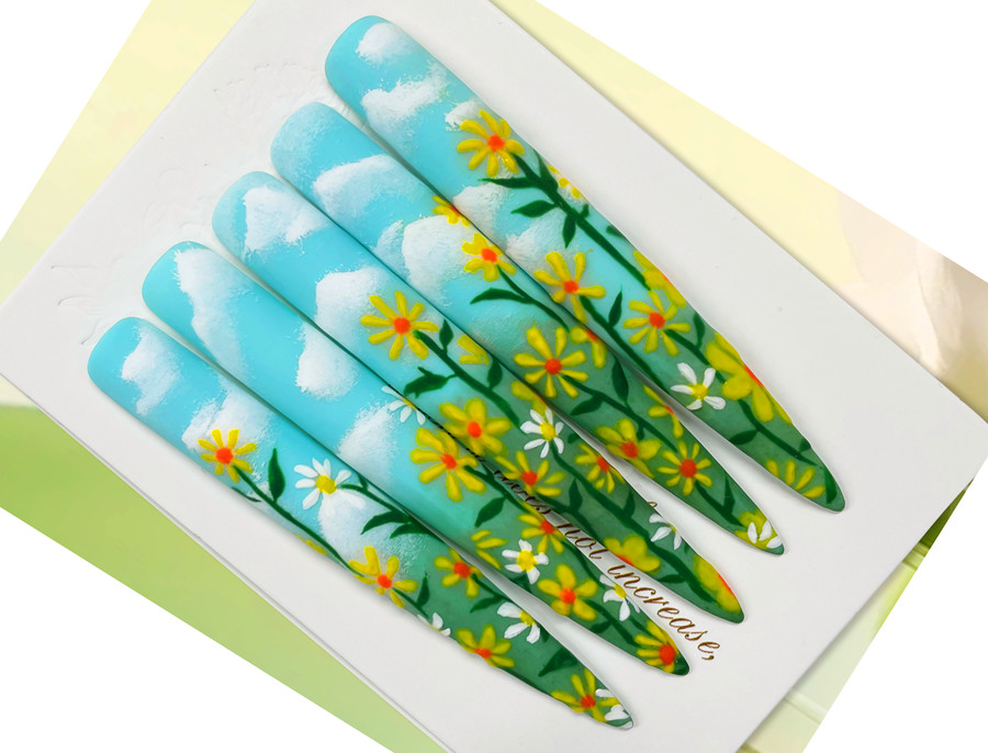 美甲技法:作品采用手繪+漸變的方式進行。色彩清新舒適,用白色和藍色畫出藍天白云,在用黃色繪制出雛菊,使用漸變筆打造綠草叢生,并以此與藍天白云相互鏈接,打造自然感,仿佛讓人有種走入歌曲《晴天》里唱的“故事的小黃花”的浪漫氛圍中。