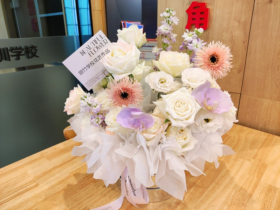 看吧!在老師的指導(dǎo)下,還有同學(xué)們自己的努力下,一個(gè)清新養(yǎng)眼且浪漫十足的白色玫瑰花抱抱桶就完成啦!純白無(wú)瑕的花束下,代表了不摻雜任何瑕疵的愛情,想必收到這個(gè)花藝作品的女孩定會(huì)十分歡喜。