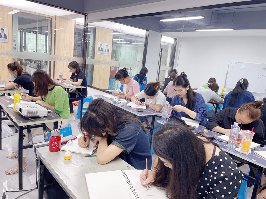廣西紋繡課堂、學紋繡在廣西:廣西紋繡職業(yè)培訓學校(麗竹紋繡學校)的廣西紋繡進修課程---《眉眼唇大師班》正在如火如荼進行中。在了解完紋繡的一些基本知識后,同學們在老師的指導下進入到了紙上畫眉的練習,為后期進行真人實操設計眉形做準備。