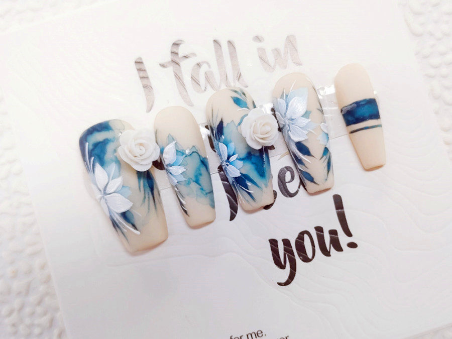 南寧美甲師、南寧美甲培訓排名:水墨畫是非常有中華民族特色的一種繪畫形式,具有單純性、象征性、自然性。它具有水乳交融,酣暢淋漓的藝術效果。整副美甲以乳白色打底,蘸取深藍色彩繪膠,使用暈染的手法打造出水墨虛實相交的效果。然后在用白色雕花膠捏出立體花瓣,這樣一副栩栩如生的國風雕花美甲便完成了。