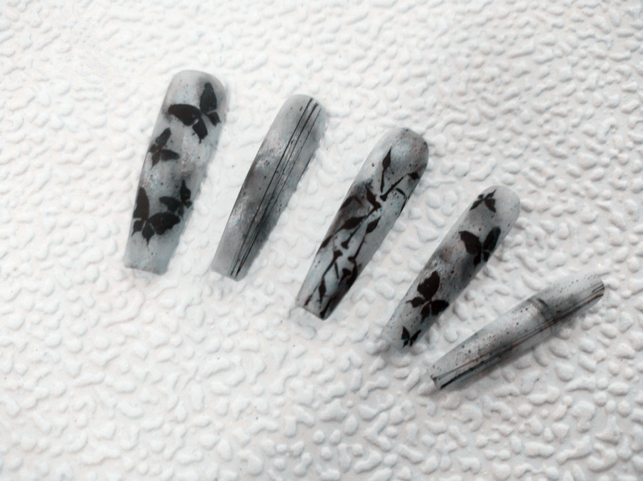 使用乳白色彩繪膠打底,蘸取黑色甲油膠在甲面上隨意鋪展開,然后在慢慢進(jìn)行自然過(guò)渡的暈染,打造色彩在水面暈開的感覺(jué)。之后在用彩繪筆畫出黑色蝴蝶圖案及其他點(diǎn)綴圖案,蕞后涂上磨砂封層,使得整副作品的圖案更加逼真,蝴蝶仿馬上就要翩翩起舞,看起來(lái)很有靈氣。同時(shí)也將經(jīng)典的文雅氣韻躍于“指”上。