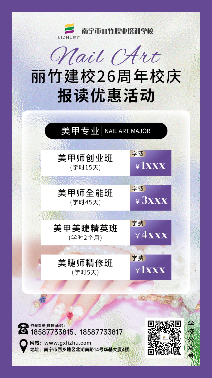 如果你喜愛美甲,想從事美甲行業(yè)的相關(guān)工作,但是不知道南寧美甲學(xué)校怎么報(bào)名?只要你對(duì)美甲感興趣,有一顆想學(xué)習(xí)的心,那千萬(wàn)不要錯(cuò)過麗竹學(xué)校正在進(jìn)行的26周年校慶之“報(bào)讀優(yōu)惠活動(dòng)”啦!歡迎關(guān)注麗竹學(xué)校了解更多課程詳情和活動(dòng)信息。