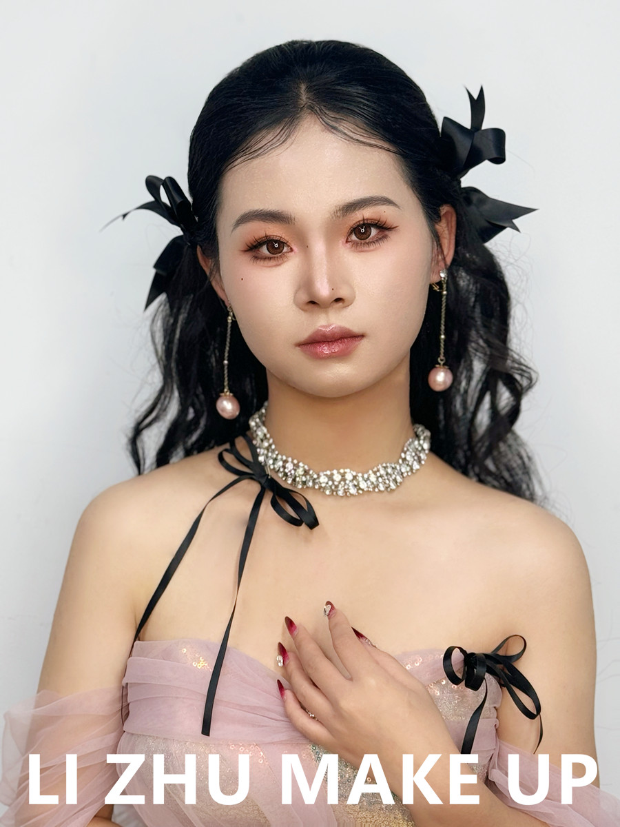 南寧化妝形象設(shè)計、南寧學(xué)化妝零經(jīng)驗、南寧化妝培訓(xùn)進修提升(麗竹化妝造型學(xué)校)作品---韓式甜美新娘:自然服貼的韓式底妝,粉橘色亮眼的眼妝和唇妝,成套蝴蝶結(jié)飾品點綴,讓身著粉色紗質(zhì)禮服造型更加甜美。