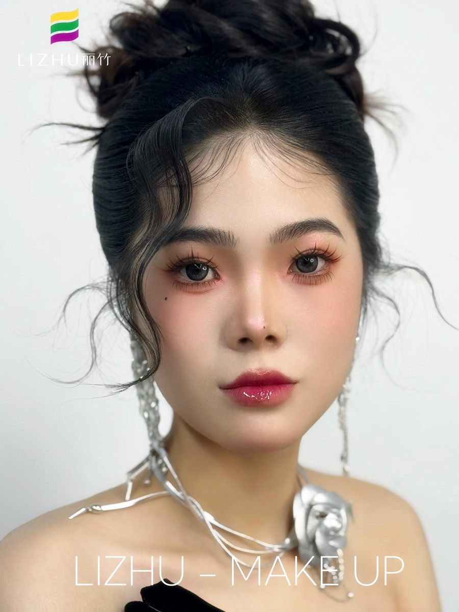 廣西彩妝化妝寫真、廣西化妝高彩、廣西學(xué)彩妝造型影樓(麗竹彩妝化妝學(xué)校)作品---千金禮服造型:極具質(zhì)感的妝容打造,蓬松自然高顱頂盤發(fā),銀色飾品的裝飾點綴,輕松拿捏豪門千金感!