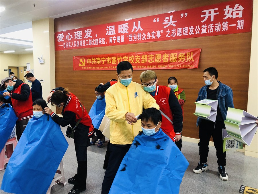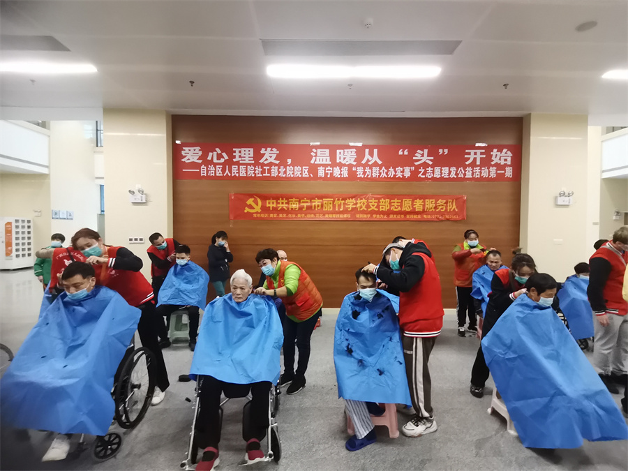 愛心理發(fā)進(jìn)醫(yī)院、南寧美發(fā)學(xué)校志愿理發(fā)活動(dòng):12月3日,對于一些長期待在醫(yī)院的患者和家屬而言,不能隨意外出,久而久之理發(fā)成為了“頭”等大事。知道這樣的情況后,中共麗竹學(xué)校學(xué)校支部志愿者服務(wù)隊(duì)主動(dòng)申請參加由南寧晚報(bào)“愛幫之家”聯(lián)合自治區(qū)人民醫(yī)院北院共同舉辦的---愛心理發(fā),溫暖從“頭”開始志愿公益理發(fā)活動(dòng),發(fā)揮專業(yè)特長,為有需要的人提供綿薄之力。