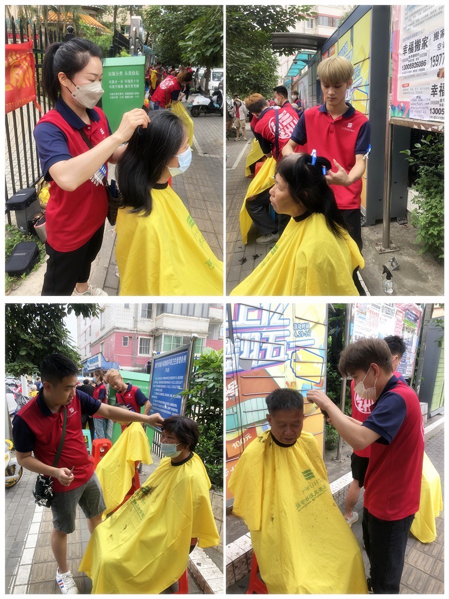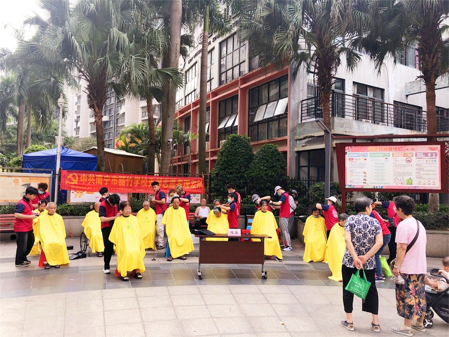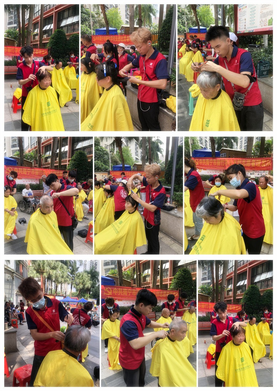2023年5月26日,南寧美發(fā)培訓(xùn)班志愿者們?yōu)榻先A府小區(qū)居民進行理發(fā)活動