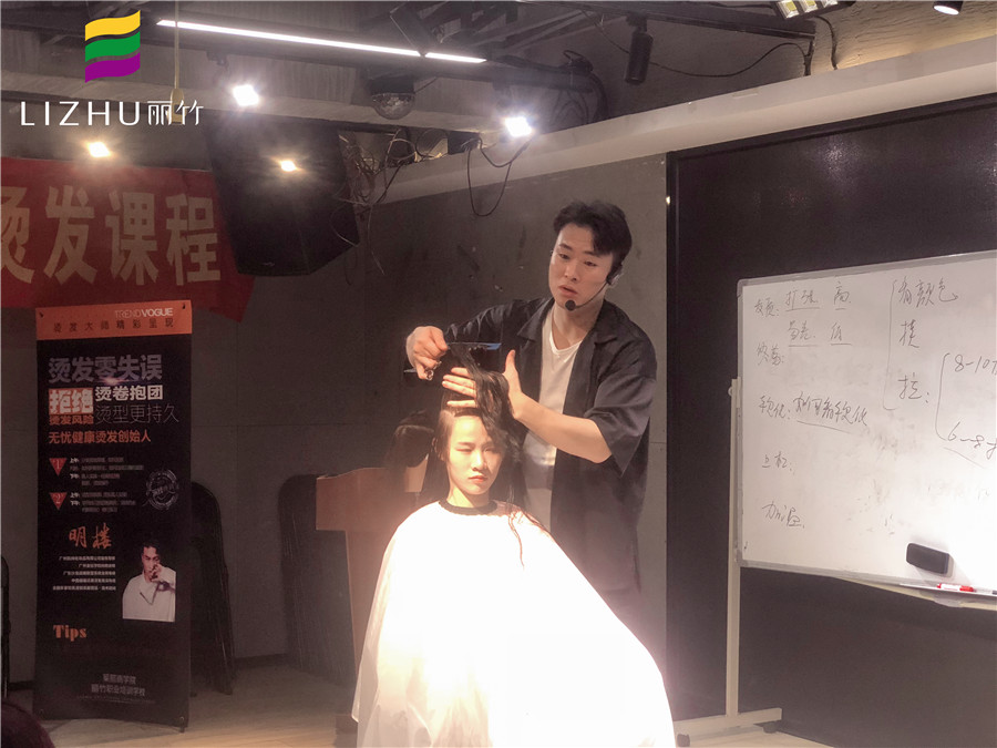 明樓老師現(xiàn)場(chǎng)進(jìn)行燙發(fā)真人實(shí)操,示范造型剪裁手法技巧,教學(xué)員落地實(shí)用美發(fā)技巧