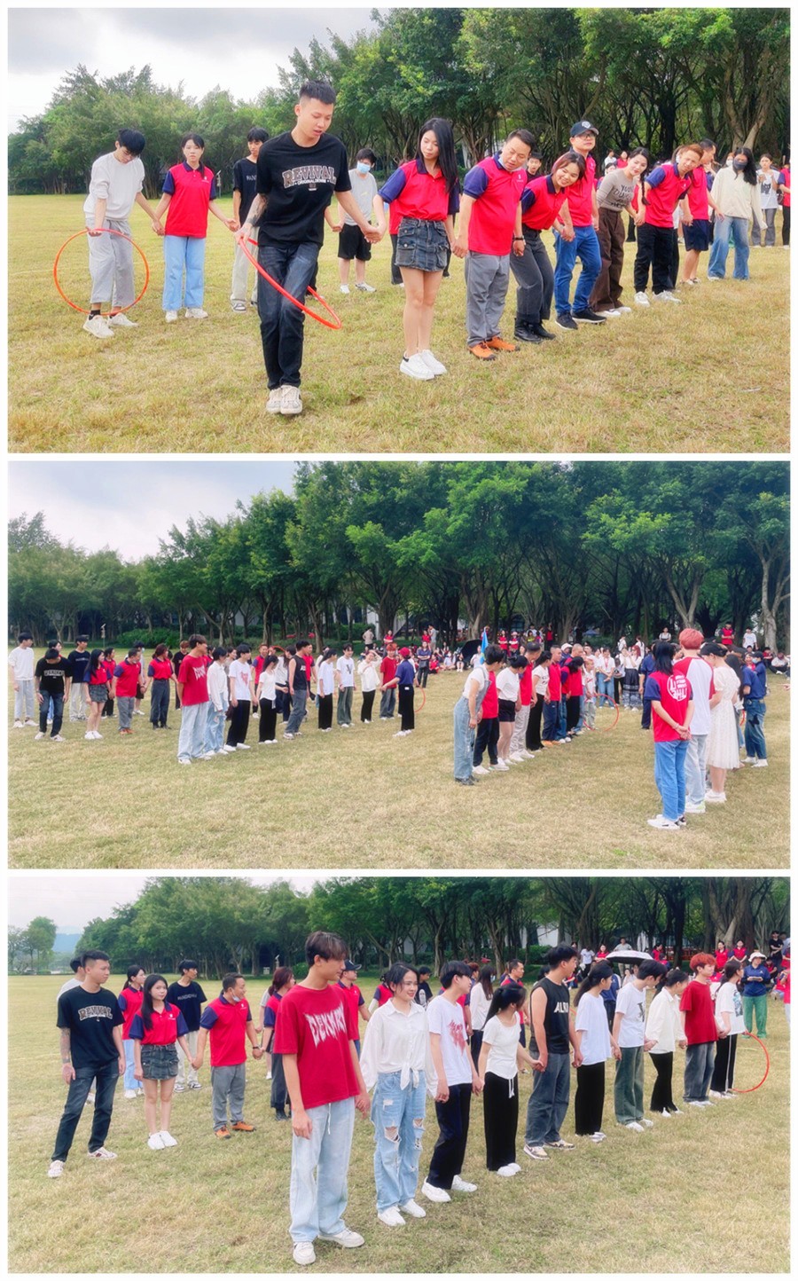 游戲中,同學(xué)們自由選擇3-5人為一組站成一排,將兩個(gè)人相鄰的腿綁到一起,然后向終點(diǎn)跑去,用時(shí)短的隊(duì)伍獲勝。這項(xiàng)游戲不僅對(duì)同學(xué)們的手腳平衡力有著極大的考驗(yàn),同時(shí)還考驗(yàn)了同學(xué)們之間的信任度。