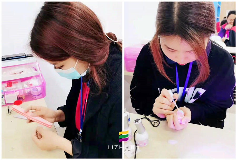 麗竹學校美甲專業(yè)-學員陸慧玲練習打磨甲片和繪制甲片圖案
